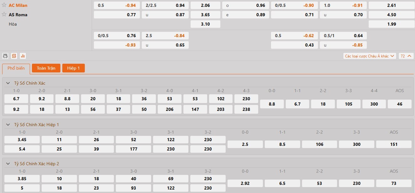 Soi kèo hiệp 1 trận AC Milan vs AS Roma