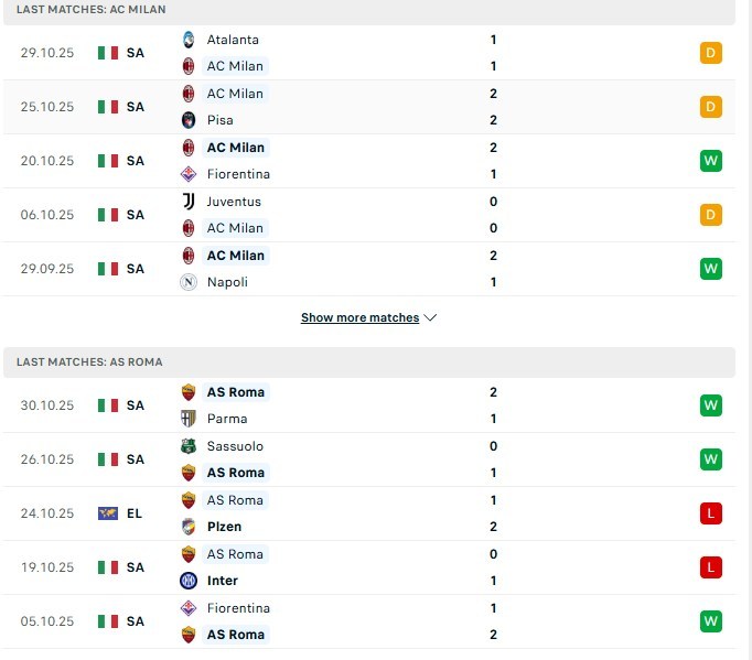 Phong độ 2 đội AC Milan vs AS Roma gần đây