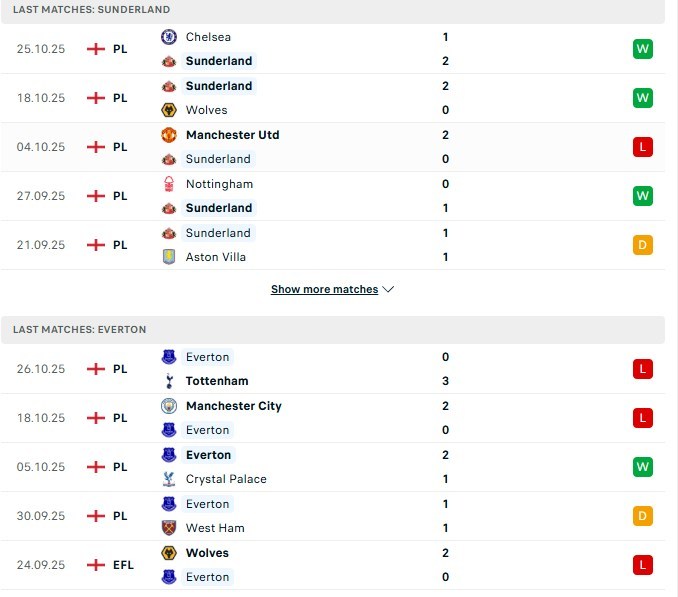 Phong độ 2 đội Sunderland vs Everton gần đây