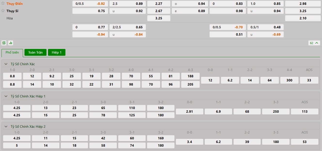 Soi kèo hiệp 1 trận Thụy Điển vs Thụy Sĩ
