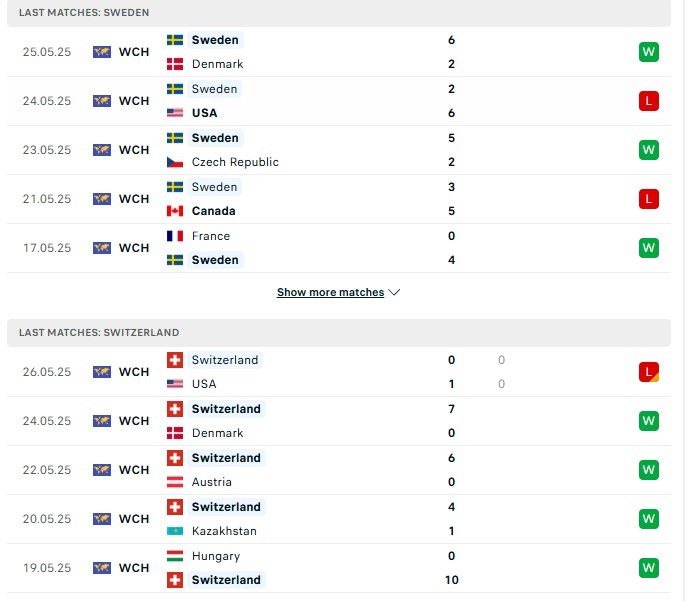 Phong độ 2 đội Thụy Điển vs Thụy Sĩ gần đây