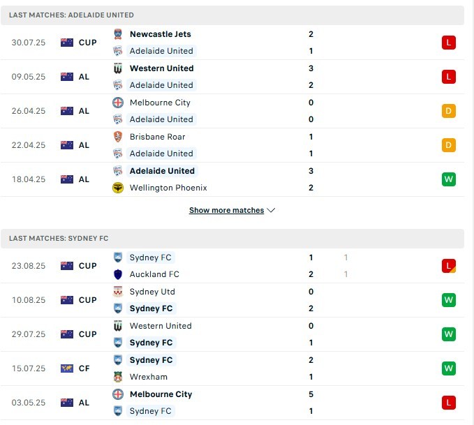 Phong độ 2 đội Adelaide United vs Sydney FC gần đây