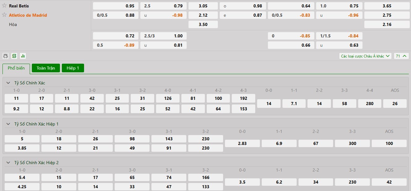 Soi kèo hiệp 1 trận Betis vs Atletico Madrid