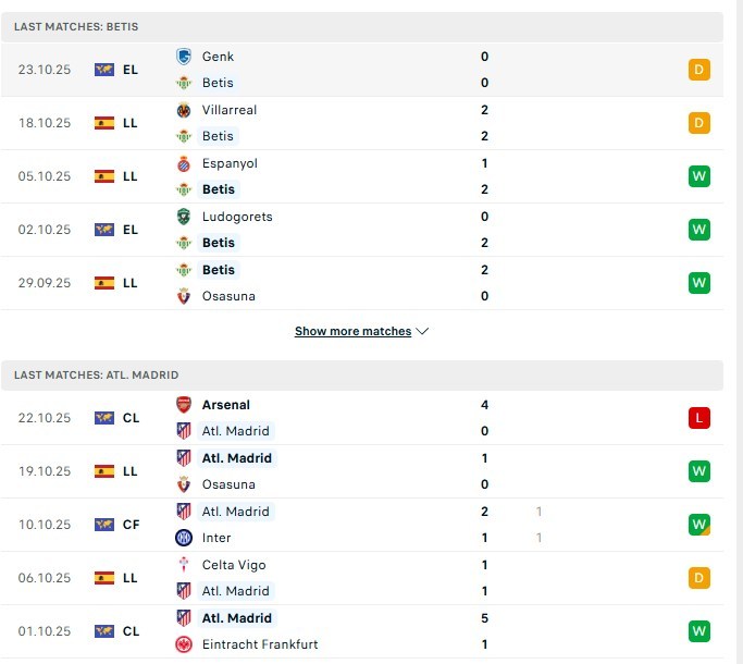 Phong độ 2 đội Betis vs Atletico Madrid gần đây
