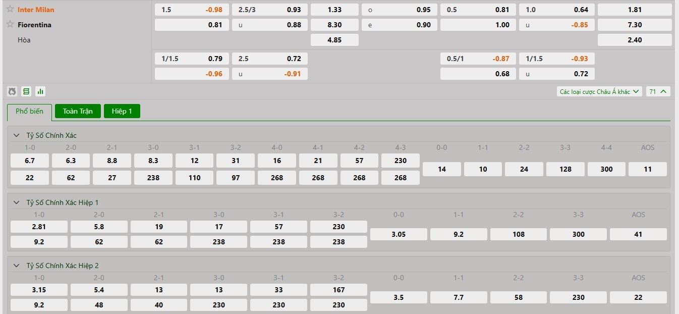 Soi kèo hiệp 1 trận Inter vs Fiorentina