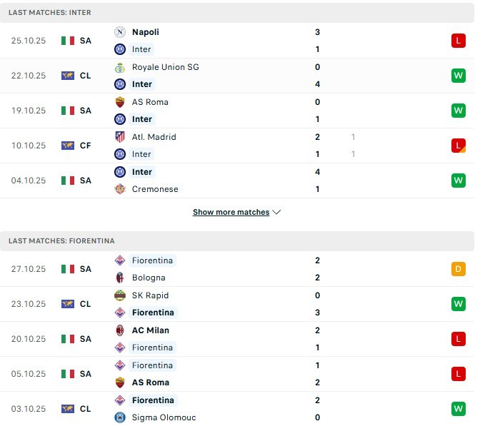 Phong độ 2 đội Inter vs Fiorentina gần đây